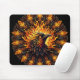 Captivating circular graphic featuring a vibrant phoenix in mid-resurrection, its fiery plumage radiating with intense oranges and yellows against a stark black background, symbolizing rebirth and immortality.