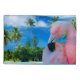 Amazing wildlife birds, flamingos. Pink flamingo, sea, palms and tropical beach.