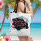 Celebrate a 'Flocking Fantastic' bachelorette weekend! Pink flamingos, tropical palm leaves and florals with gradient backgrounds, from hot pink to bold turquoise, are accented by paint strokes and arched geometric shapes in solid black. This colorful tote bag design uses a little "colorful" language as a unique way to remember your destination bachelorette. Search ID930 to see all the coordinating products in this collection.