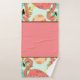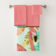 This bath hand towel set is shown in a solid color of coral pink with flamingos, tropical leaves and chocolate brown accents stripes.