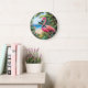 This round wall clock features a vibrant illustration of a flamingo standing on a tropical beach. Lush palm trees and a serene ocean backdrop surround the flamingo. The clock face has clear numerals and black hands, blending functionality with whimsical design. The overall aesthetic evokes a relaxing, tropical paradise, perfect for adding a touch of summer to any space.