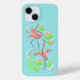 Lively pink flamingos flap their wings and ruffle their feathers against a blue watery background with reeds and water lilies. A mid-century inspired design with a retro touch which can be personalised with your own text, images and ideas. An original digital art image created by Quirky Chic.