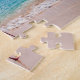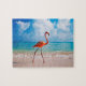 This game puzzle is shown with a photo print of flamingo bird on the beach.