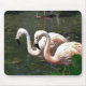 A shot of Pink Flamingo's shot closeup that's on a Mouse Pad with green tree's and water in Salina Kansas.