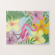 Beautiful, pink flamingo in combination with colorful, watercolor, floral garden.