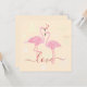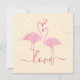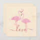 Flamingos in love with hearts and the word "love" in script typography overlaying tropical elements. On the back of the card "I love you more each day".