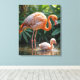 A vibrant scene features a tall flamingo standing beside its chick as it splashes in the water, surrounded by lush green foliage.