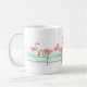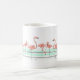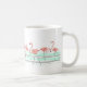 Mid-century inspired design with a retro touch featuring a group of pink flamingos standing in aqua water against a white background. A customizable design for you to personalise with your own text, images and ideas. An original digital art image created by Jess Perry at QuirkyChic Retro.