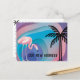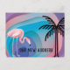 Pink, purple, and aqua gradient shapes create an artistic background reminiscent of Miami South Beach colors. A pink flamingo and line art palm tree confirm that this change of address card is announcing your move to Florida. All text on front and back of the new address postcard can be easily revised by selecting "Personalize this template."