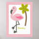 This poster for the nursery features an illustration of a pink flamingo with a palm tree and pink border. Personalize the name in green.