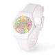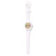 I only have one complaint. I ordered the watch with clear case and strap, and what was sent was white case and strap. I'm going to keep it because 1) it looks very nice in white, and 2) it would take too long to get a replacement made and sent in time for my occasion. Aside from the mix up with the color, the watch does look very good in white. The purple dial is actually sparkly which did not show in the online images. That was a nice surprise. If you like Swatch watches this is very similar to those. It's 33.6mm in diameter, 10.5mm thick, and 40.6mm lug to lug. Stainless steel case back says 3ATM/30m WR, so no swimming or showering or submerging this one. If you like Woodstock, this is a great choice.