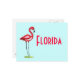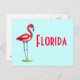 A postcard featuring a unique illustration of a flamingo standing in a small pool of water. Light aqua backgroud, red text. Reads "Florida."