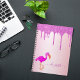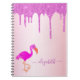 A faux rose gold metallic looking background. Purple faux glitter drips as decoration and a cute hot pink colored flamingo. Personalize and add your name. The name is written with a large modern hand lettered style script. Purple colored letters. To keep the swashes only delete the sample name, leave the spaces or emoji's in front and after the name