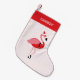 An animal Christmas stocking featuring a smiling flamingo in a Santa outfit and a customizable name. Simply add your special name, add this stocking to your cart, and have a flamingo-tacular Christmas!