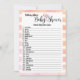 Soft, watercolor, girly peach coral and white stripes background. Cute, pink, flamingo in the middle of "Baby Shower" script. Template created just for you on this Animal Baby Name Game, with 20 names of animals and your guests can guess what each one's baby is named.
