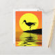 A Bright and cheery postcard to send someone with a silhouette of a flamingo on an island in front of a yellow and orange sunset.