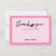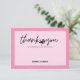 Let your guests know you appreciate them celebrating your birthday party with you by sending them these thank you cards featuring "thank you" typography in modern handwriting script with a silhouette of a flamingo holding a cocktail on a hand painted pink background with coordinating watercolor stripes on the reverse side. Art by KL Stock.