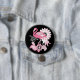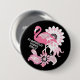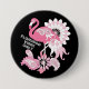 The product design features a flamingo with kaleidoscopic paisley patterns in shades of pink. This tropical bird design with personalized text makes a modern and unique pinback button.