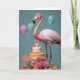 Embrace the tropical vibes with this vibrant birthday card. The star of the show is a graceful flamingo, standing tall and proud next to a large, beautifully decorated birthday cake. The base of the cake is adorned with an array of flowers, adding a touch of nature's charm to the scene. Three balloons float in the background, their colors popping against the soothing teal backdrop. The entire scene is a burst of color and joy, perfectly capturing the spirit of a birthday celebration. Inside the card, a blank space awaits your personal message.
