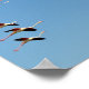 Flamingos in flight (Phoenicopterus ruber) on the blue sky background, in the Camargue is a natural region located south of Arles, France, between the Mediterranean Sea and the two arms of the Rhône delta