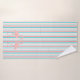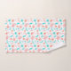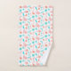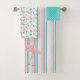 Here's a cute tropical theme towel set that uses soft teal and coral pink as the predominant colors. The bath towel has a pretty stripe pattern in light coral, dark coral, light teal, dark teal, and white. At the bottom of the towel is an adorable image of two pink flamingos. With their heads close together, they form a heart. The hand towel is white, with a repeating pattern in matching coral pink and teal, of flamingos and hibiscus flowers. The washcloth is matching teal, with white polkadots. This set is beautiful for any bathroom with a tropical theme.