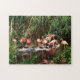 Full color nature photograph of beautiful pink flamingos in a lush pond setting jig saw puzzle. Have fun putting this puzzle together. Fun for all ages.