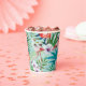 Brightly colored Luau cups with a flamingo & palm print. Turquoise green, pink, and blue.