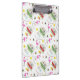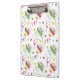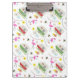 A clipboard featuring a retro themed pattern with illustrations of pink flamingos, flowers, bunting, bees, and retro campers.