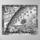A vintage engraving depicting a star-studded sky and the earth with the sun rising among a marvellous realm of circling clouds in the heavens.