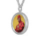 I chose gold plated so that the metal would not react with my skin oils and perspiration. But, I changed the necklace from the gold plated one to a sterling silver. My skin cells will tarnish the silver. But it will not look as bad if some portion of the gold plated necklace somehow became compromised. Zazzle did a find job turning the picture into a pendant for me. As you can see, the colors and the printing of the final product, match the preview. The picture I took is not very clear. But I am pleased with the product I received.