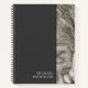 A contemporary professional style notebook design with a neutral marble pattern accent over a flat black background. Add your name or business info in place of the sample text shown in the design template.