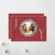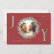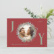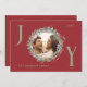 Send warm holiday wishes with this elegant Joy Christmas card featuring a crisp red background and festive green and red wreath foliage framing your family photo. The letters "J" and "Y" are written in sage green, adding a joyful touch to the design. The "O" houses the family photo within the wreath. The card is customizable with your family details and includes the perfect Christmas message inside, making it a thoughtful and personal way to celebrate the season.