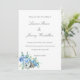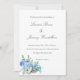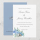 Casual coastal wedding invitation with blue hydrangeas, oyster shells and eucalyptus.