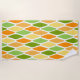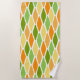This beach towel has a mid-century modern design of flattened diamonds in shades of yellow, orange, and green.