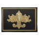 20” x 14” black cloth placemat with an image of an antique gold fleur de lis and a gold border. See matching paper placemat, kitchen towel, cloth napkin, paper cocktail napkin and coasters. See the entire Cancan Placemat collection in the FOOD/BEV | Linens section.