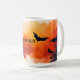 Bats fly across a sunset-colored background on this beautiful, creepy, and spooky coffee mug for Halloween.