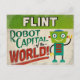 A funny Flint Michigan vintage travel postcard featuring a friendly robot with fun retro style text that says, "Flint, Robot Capital of the world!"
