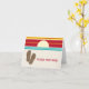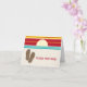 A notecard featuring an illustration of a 70s inspired sunset at top half. Illustration of brown flip flops at bottom left. Personalize with your name in red to the right of the flip flops. look for matching items at Jill's Paperie.