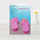 Pink and white polka dot flip-flops with yellow daisy by swimming pool for retirement congratulations.