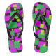 Get some fabulous and funky flip flops just in time for Summer! These flip flops feature a fun abstract geometric pattern of squares and rectangles , in shades of green , purple, and black. Available in adult and child sizes. Some styles offer choice of strap color. Original artwork on sandals by Buttercup's Clothing and Collectables