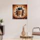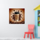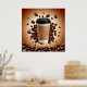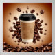 A disposable takeout coffee cup floats at the center, surrounded by rich coffee beans. Warm, cafe-inspired energy evokes morning routines, grab-and-go culture, and cozy beverage moments.