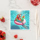 A macaw is lounging on a pink inflatable ring in a sparkling blue pool wearing sunglasses and enjoyin a cocktail