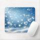 Floating hearts dance amidst a serene, snow-like landscape illuminated by a soft, ethereal glow