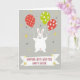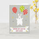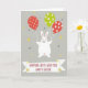 This card features a plump white bunny with long ears floating gently in midair 🐰. Three round balloons lift it up—two are bright red with white polka dots, and the third is lime green with oval decorations that suggest painted eggs. The bunny’s eyes are closed with rosy cheeks and a tiny pink mark on its belly, and its outstretched paws give it the look of drifting toward a friend’s hug. Behind it, a soft light gray background keeps the scene calm and airy, like a quiet spring morning. Small yellow flower shapes and short dark gray dash marks scatter around like little bursts of celebration 🌷. Below the bunny, a white ribbon banner stretches across the card with a seasonal greeting printed in a casual, rounded style, standing out clearly against the pale ribbon. The ends of the banner are accented with small yellow flowers, and the confetti-like dashes continue around the edges of the design.