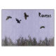 Four ravens flying on a cloudy day. Customizable text reading "Ravens" also appears. The collective noun for ravens (as in a gaggle of geese) is an “unkindness” and when I see a group of them fly over I always get the impression I am watching a street gang. They are fairly heavy birds and you can hear their wings – swish, swish, swish – beat the air as they pass by. Ravens, found across the northern hemisphere, typically live about 10 to 15 years in the wild, although lifespans of up to 40 years have been recorded. Young birds may travel in flocks, but later mate for life, with each mated pair defending a territory. The Common Raven has coexisted with humans for thousands of years and in some areas has been so numerous that it is considered a pest. Part of its success comes from its omnivorous diet; Common Ravens are extremely versatile and opportunistic in finding sources of nutrition feeding on carrion, insects, cereal grains, berries, fruit, small animals, and food waste. Some remarkable feats of problem-solving have been observed in the species, leading to the belief that it is highly intelligent. Over the centuries, it has been the subject of mythology, folklore, art and literature. In many indigenous cultures, including those of Scandinavia, ancient Ireland and Wales, Bhutan, the northwest coast of North America, Siberia and northeast Asia, the Common Raven has been revered as a spiritual figure or god. Ravens are classified as songbirds. Though I have never thought of them as particularly musical they do make a very large number of sounds. Ravens mimic sounds from their environment, including human speech. Ravens are highly intelligent. Their brains are among the largest of any bird species. They display problem solving abilities, as well as other cognitive processes such as imitation and insight. One experiment involved a piece of meat attached to a string hanging from a perch. To reach the food, the bird needed to stand on the perch, pull the string up a little at a time, and step on the loops to gradually shorten the string. Four of five Ravens eventually succeeded, and “the transition from no success (ignoring the food or merely yanking at the string) to constant reliable access (pulling up the meat) occurred with no demonstrable trial-and-error learning” This supports the hypothesis Ravens are ‘inventors’; that is, they have the ability to solve problems presented to them. Many of the Raven’s problem-solving skills were formerly thought to be instinctive, but it is becoming clear that Common Ravens are actually quite intelligent. Ravens have been observed to manipulate others into doing work for them, such as by calling wolves and coyotes to the site of dead animals. The canines open the carcass, making it more accessible to the birds. They watch where other birds bury their food and remember the locations of each other’s food caches, so they can steal from them. This type of theft occurs so regularly that Ravens will fly extra distances from a food source to find better hiding places for food. They have also been observed pretending to make a cache without actually depositing the food, presumably to confuse onlookers. Ravens living in urban environments have been known to drop nuts that they are incapable of cracking open with their beaks into busy road intersections. They allow the traffic to drive over them, crushing the nuts. When the traffic stops, they swoop down and pick up the nuts to eat. Biologists have recognized that birds engage in play. Juvenile Ravens are among the most playful of bird species. They have been observed to slide down snowbanks, apparently purely for fun. They even engage in games with other species, such as playing catch-me-if-you-can with wolves and dogs. Ravens are known for spectacular acrobatic displays, such as flying in loops or interlocking talons with each other in flight. Ravens are one of only a few species who make their own toys. They have been observed breaking off twigs to play with socially. Across its range in the northern hemisphere, and throughout human history, the Common Raven has been a powerful symbol and a popular subject of mythology and folklore. In many post-conversion Western traditions, ravens have long been considered to be birds of ill omen, in part because of the negative symbolism of their all-black plumage and eating of carrion. In Sweden, ravens are known as the ghosts of murdered people, and in Germany as the souls of the damned. In Danish folklore, a Valravn that ate a king’s heart gained human knowledge, could perform great malicious acts, could lead people astray, had superhuman powers, and were “terrible animals”. It continues to be used as a symbol in areas where it once had mythological status: as the National Bird of Bhutan, Official Bird of the Yukon territory, and on the Coat of Arms of the Isle of Man (once a Viking colony). Many indigenous peoples of the Pacific Northwest Coast of North America and northeast Asia revered it as a god. In Tlingit and Haida cultures, Raven was both a Trickster and Creator god. Related beliefs are widespread among the peoples of Siberia and northeast Asia. The Kamchatka peninsula, for example, was supposed to have been created by the raven god Kutkh. There are several references to Common Ravens in the Old Testament of the Bible and it is an aspect of Mahakala in Bhutanese mythology. The Norsemen believed that ravens Hugin and Munin sat on the god Odin’s shoulders and saw and heard all, and a Raven banner standard was carried by such Viking figures as the Norse Jarls of Orkney,King Canute the Great of England, Norway and Denmark, and Harald Hardrada. In the British Isles, ravens also were symbolic to the Celts. In Irish mythology, the goddess Morrígan alighted on the hero Cú Chulainn’s shoulder in the form of a raven after his death. In Welsh mythology they were associated with the Welsh god Bran the Blessed, whose name translates to “rav