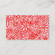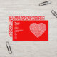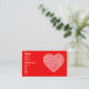 A business card with an attractive flocked floral heart design drawn red on white. The back shows a detail of the flower drawing.
