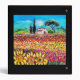 Tuscany landscape,colorful ,vibrant ,expressive beauty of Italian countryside and fields in bright yellow orange,pink,fuchsia,purple,red,green,brown,yellow colors,beautiful Summer flora, ,meadows,flowers,cypress and olive trees,rustic old farm house under the blue sky.Acrylic painting on canvas .