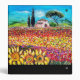 Tuscany landscape,colorful ,vibrant ,expressive beauty of Italian countryside and fields in bright yellow orange,pink,fuchsia,purple,red,green,brown,yellow colors,beautiful Summer flora, ,meadows,flowers,cypress and olive trees,rustic old farm house under the blue sky.Acrylic painting on canvas .