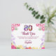 Show your gratitude in style with this elegant 80th birthday thank you card featuring vibrant floral accents and a heartfelt message. The front of the card displays a large "80" in colorful floral design and the words "Thank You" in a bold script, followed by a customizable message. The back side features a touching note of appreciation for celebrating a milestone of 80 wonderful years filled with love, laughter, and memories. This card is the perfect way to express your thanks for attending your special day and for any generous gifts received. Easily personalize this thank you card to reflect your own unique sentiments. Enjoy!
