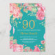Floral 90th Birthday Gold Glitter and Teal Invitation